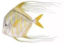 双棘甲尻鱼体呈卵型,体被中小型栉鳞,前鳃盖骨具棘,间鳃盖骨无棘,体黄色,具8~9条淡青色之黑边横带,由背鳍前方至眼后有一黑边之淡青色带,臀鳍褐色,具数条青色纵纹,背鳍软条部黑色。全部>>