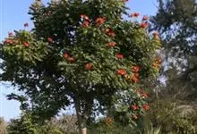 火焰树是紫葳科、火焰树属乔木,树皮平滑,灰褐色。奇数羽状复叶,对生,连叶柄长达45厘米;小叶13-17枚,叶片椭圆形至倒卵形,伞房状总状花序,顶生,密集;被褐色微柔毛,具有明显的皮孔;花冠一侧膨大,…全部>>