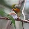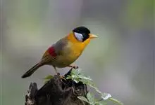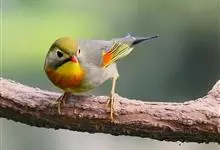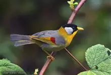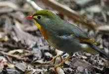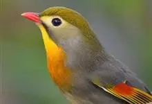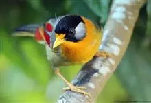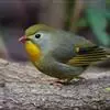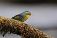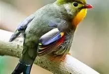 银耳相思鸟小型鸟类,体长14~18厘米。头顶黑色,耳羽银灰色,前额橙黄色;外侧飞羽橙黄色,基部朱红色,极为鲜艳、醒目。尾圆形,尾上、尾下覆羽朱红色,尾暗灰褐色,外侧尾羽橙黄色,其余上体橄榄绿或橄榄黄色。…全部>>