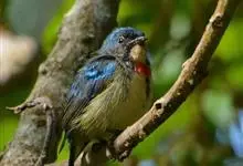 红胸啄花鸟:体重5-10克,体长60-92毫米。体形纤小。雄鸟上体呈辉亮的金属绿色;下体棕黄,胸部具一朱红色块斑,极易与其他啄花鸟区别。雌鸟上体呈橄榄绿,下体棕黄色。虹膜褐色,嘴褐黑色或角灰色,…全部>>