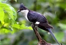斑翅凤头鹃: 成鸟具羽冠,上体及头侧、翅、尾等黑色,具铁绿色亮辉,尾羽端部具白斑,两侧者形宽,中央者较狭;下体白色、淡灰白或略带棕黄色。虹膜褐至红褐色;嘴黑色;脚灰蓝黑色。…全部>>