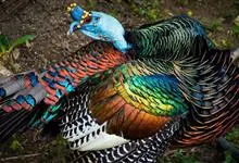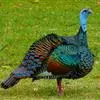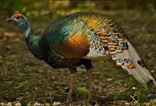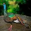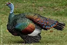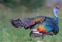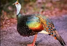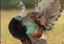 眼斑吐绶鸡:是火鸡科的两种鸟类之一。体型比普通火鸡略小些,体长1米左右,体重2.4-5.4千克,雄性比雌性略大,长得很特别,蓝色的秃脑袋上冒出几个橙黄色的疙瘩。但是它羽色艳丽,身体呈铜色及绿色。…全部>>