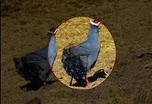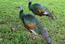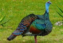 眼斑吐绶鸡:是火鸡科的两种鸟类之一。体型比普通火鸡略小些,体长1米左右,体重2.4-5.4千克,雄性比雌性略大,长得很特别,蓝色的秃脑袋上冒出几个橙黄色的疙瘩。但是它羽色艳丽,身体呈铜色及绿色。…全部>>