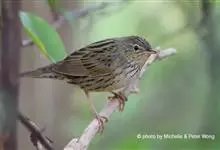 矛斑蝗莺:体长11-14厘米,体重9-13克。上体橄榄褐色密布粗著的黑褐色纵纹,眉纹淡黄色细而不明显,下体乳白色具黑色纵纹,尾羽腹面无白端。虹膜暗褐色;嘴黑褐色,下嘴基黄褐色;脚肉色。…全部>>