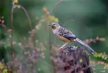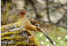 大噪鹛:中型鸟类,体长32-36厘米。额至头顶黑褐色,背栗褐色满杂以白色斑点,斑点前缘或四周还围有黑色。初级覆羽、大覆羽和初级飞羽具白色端斑。尾特长,均具黑色亚端斑和白色端斑。颏、喉棕褐色,…全部>>