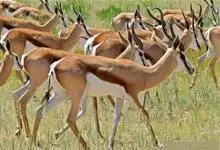 跳羚是哺乳纲、偶蹄目、牛科哺乳动物,属于中型的羚羊。四肢细长;背面毛色黄褐,臀部及其背面、腹部、四肢内侧均为白色,在身体两侧背腹之间 有一红褐色条带;背部中央有1条纵向的由皮肤下凹而形成的褶皱,…全部>>