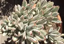 褐斑伽蓝是景天科伽蓝菜属的多年生多肉类植物,茎直立,多分枝,叶生于枝上,肉质叶片匙形,上面密被白色绒毛,下部全缘,叶缘上部有缺刻,缺刻处有深褐或棕色斑块。褐斑伽蓝原产非洲的马达加斯加岛。…全部>>