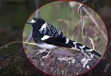 斑背燕尾是鹟科、燕尾属中型鸟类,体长24-25厘米。额至头顶前部白色,其余头、颏、喉、胸黑色,后颈有一白领,背黑色具圆形白色斑点,腰白色,两翅黑色具白色翅斑,尾呈深叉状,黑色、具白色端斑。…全部>>