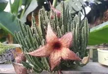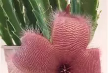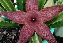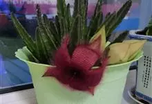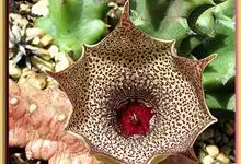 巨花犀角又称大豹皮花,是夹竹桃科犀角属的一种植物。茎粗,花大,边缘生长细毛。植株柱形多分枝呈丛生,柱形具4棱,棱缘具细小疣突。花大,五角星形黄色,并有横向棕褐色斑纹,似豹皮而得名。花期夏秋两季。…全部>>
