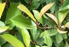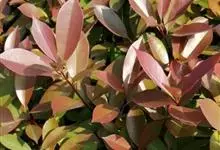 红叶石楠 是蔷薇科,石楠属杂交种,为常绿小乔木或灌木,乔木高可达5米、灌木高可达2米。叶片革质,长圆形至倒卵状、披针形,叶端渐尖,叶基楔形,叶缘有带腺的锯齿,花多而密,复伞房花序,花白色,梨果黄红色,…全部>>