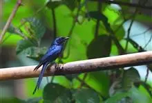 发冠卷尾是中型鸟类,体长28-35厘米。通体绒黑色缀蓝绿色金属光泽,额部具发丝状羽冠,外侧尾羽末端向上卷曲。栖息于海拔1500米以下的低山丘陵和山脚沟谷地带,多在常绿阔叶林、次生林或人工松林中活动。…全部>>