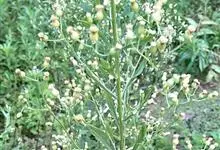 苏门白酒草 Walker)是菊科,白酒草属一年生或二年生草本植物,纤维状根。纺锤状,茎粗壮,直立,高可达150厘米,叶密集,基部叶花期凋落,叶片狭披针形或近线形,头状花序多数,总苞卵状短圆柱状,总苞…全部>>