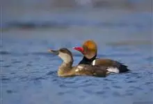 赤嘴潜鸭俗称大红头,是大型鸭类,个体比绿头鸭小,体长45-55厘米,体重1千克左右。雄鸟头浓栗色,具淡棕黄色羽冠。上体暗褐色,翼镜白色,嘴赤红色。下体黑色,两胁白色,特征极明显,野外容易辨别。…全部>>