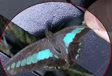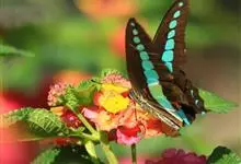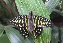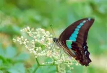 青带凤蝶Graphium sarpedon ,又名青凤蝶,是最普遍的中型凤蝶,飞行速度很快。青带凤蝶的翅膀中央有许多浅蓝色的斑点,很整齐地排列成一条直线。这些斑点由上而下逐渐变大,就像一条青色的带子。全部>>