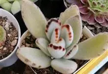 褐斑伽蓝是景天科伽蓝菜属的多年生多肉类植物,茎直立,多分枝,叶生于枝上,肉质叶片匙形,上面密被白色绒毛,下部全缘,叶缘上部有缺刻,缺刻处有深褐或棕色斑块。褐斑伽蓝原产非洲的马达加斯加岛。…全部>>