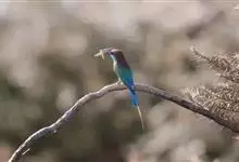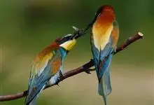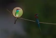 栗喉蜂虎是蜂虎科蜂虎属的鸟类。有热带鸟类羽毛艳丽的特征:喉部是栗红色的,黑色的过眼纹,翅膀和背部是绿色的,尾翼是蓝色的,飞行时翅膀下面的羽毛是橙黄色的,在阳光的照射下,它们全身闪烁着金属般的艳丽光泽,…全部>>
