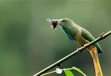 蓝须夜蜂虎是佛法僧目、蜂虎科的鸟类,体长约30厘米,是绿色林栖型蜂虎,蓝色的胸羽蓬松,嘴厚重而下弯。成鸟顶冠淡蓝,腹部棕黄带绿色纵纹。尾羽腹面黄褐。亚成鸟全身绿色。喉、胸部中央的羽甚长和亮色;该物种…全部>>