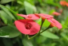 铁海棠为大戟科大戟属蔓生灌木植物;茎多分枝,具纵棱,呈旋转状;叶互生,通常集中于嫩枝上;每个花序基部边缘具微小的红色尖头;苞叶先端圆且具小尖头,无柄,上面鲜红色,下面淡红色;苞片丝状;子房光滑无毛,…全部>>
