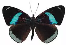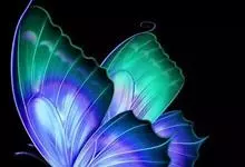 天堂凤蝶翅展可达105mm。前、后翅自基角至后缘约1/2~2/3端为纯净的宝蓝色,后角至后缘1/3~1/2端为黑色,后翅有黑色的尾突。翅背面为棕褐色。全部>>