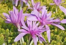 秋水仙是百合科、秋水仙属植物,多年生草本。地下部分也具有圆球形的鳞茎。它的这种鳞茎,有的直径可长至6厘米以上。球根花卉,球茎卵形,外皮黑褐色。叶披针形,暗绿色,长约30厘米。每开花1-4朵,花纺形,…全部>>