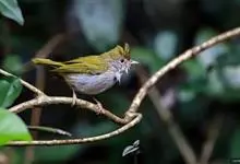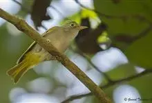 白腹凤鹛是绿鹃科、绿凤鹛属的小型鸟类,体长10-12厘米。上体从头到尾黄绿色,有短的羽冠,头顶微具黑色羽轴纹;眼先、眼周,耳羽和下体灰白色,尾下覆羽黄色。虹膜褐色或红褐色,上嘴浅褐色或肉褐色,…全部>>