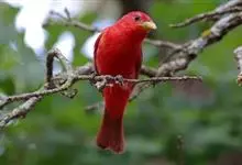血雀雀科朱雀属鸟类,体重36-49克;体长155-182毫米。雄鸟除眼先、翼与尾为黑色外,通体为鲜红色;嘴鲜黄;雌鸟暗橄榄绿色,羽端较淡或带黄色;腰鲜黄;嘴较暗。虹膜褐色;嘴黄色;腿和脚褐色。…全部>>