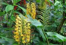 黄姜花:姜科,姜花属多年生草本草本芳香花卉,秋冬季开花,穗状花序,长圆形;苞片长椭圆形,覆瓦状排列,每一苞片内有花3-5朵;花深黄色,形似蝴蝶,气味芬芳纯正,沁人心脾;唇瓣倒心形,黄色,…全部>>