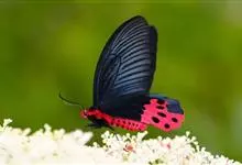 玉斑凤蝶Papilio helenus 别名白纹凤蝶,是凤蝶科凤蝶属美凤蝶亚属大型种类。雌雄同型;体翅皆黑色,后翅正面中室外有3个并列的白色斑,亚外缘有1列模糊的新月形红色斑,…全部>>