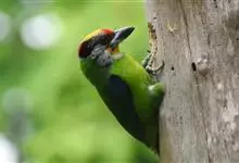 绿拟啄木鸟为鴷形目,须科,拟啄木属的一种。形较大拟啄木鸟略小,体长约260mm。头、颈及胸浅褐而具淡黄白色条纹;喉几为淡黄白色;身体余部草绿色。虹膜棕褐色,眼周裸露部黄色;嘴峰角黄色;跗跖和趾角黄…全部>>