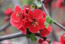 贴梗海棠 Nakai)是蔷薇科、木瓜海棠属植物。落叶灌木,高达2米,枝条直立开展,有刺。叶片卵形至椭圆形,稀长椭圆形,长3-9厘米,宽1.5-5厘米。花先叶开放,3-5朵簇生于二年生老枝上。…全部>>