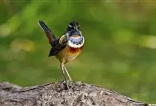 蓝点颏亦称“蓝喉歌鸲”,通称蓝靛颏儿。身体大小和麻雀相似,体长12-13厘米,体重17-18克。头部、上体主要为土褐色。眉纹白色。尾羽黑褐色,基部栗红色。颏部、喉部辉蓝色,下面有黑色横纹。下体白色。…全部>>