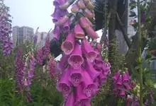 毛地黄是车前科、毛地黄属一年生或多年生草本植物。株高0.5—1米,茎直立,少分枝,全株被灰白色短柔毛和腺毛叶基生,呈莲座状,卵圆形或卵状披针形。顶生总状花序,花冠钟状,紫红色,内面有浅白斑点。菊果卵形。…全部>>