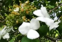 蝴蝶戏珠花 Miq.)是荚蒾科荚蒾属植物。落叶灌木,高达3米;当年小枝浅黄褐色。叶较狭,宽卵形或矩圆状卵形,有时椭圆状倒卵形。花序直径4-10厘米,外围有4-6朵白色、木型的不孕花。果实先红色后变黑色,…全部>>