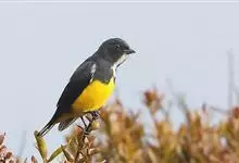 黄腹啄花鸟:体重11-16克,体长104-117毫米。是一种体型大,下腹部为艳黄色的啄花鸟,雄鸟特征为头黑色,喉部有白色纵斑、喉侧及上体成对比,两翅和尾黑色,外侧尾羽内翈具白色斑块。其余下体淡黄色。…全部>>