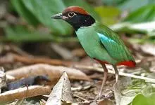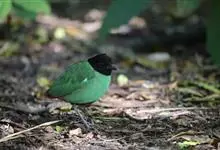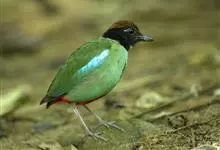 绿胸八色鸫:是雀形目八色鸫科的鸟类,共有12个亚种。体长为16-18厘米,体重65-69克。体型圆胖,尾短,腿长。头黑,上体绿色,两翼深色而具白色斑纹,头顶至后枕深褐,胸及腹部苹果绿,臀亮红。…全部>>