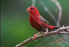 红梅花雀小型鸟类,体长9-10厘米。雄鸟通体朱红色,背、肩、胸等满布白色小斑点,两翅和尾黑褐色均具白色端斑,嘴红色,脚蜡黄色。雌鸟上体淡褐色或赭褐色,翅上中覆羽、大覆羽和内侧飞羽末端具白色斑点,…全部>>