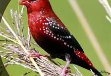 红梅花雀小型鸟类,体长9-10厘米。雄鸟通体朱红色,背、肩、胸等满布白色小斑点,两翅和尾黑褐色均具白色端斑,嘴红色,脚蜡黄色。雌鸟上体淡褐色或赭褐色,翅上中覆羽、大覆羽和内侧飞羽末端具白色斑点,…全部>>