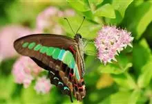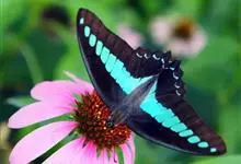 青带凤蝶Graphium sarpedon ,又名青凤蝶,是最普遍的中型凤蝶,飞行速度很快。青带凤蝶的翅膀中央有许多浅蓝色的斑点,很整齐地排列成一条直线。这些斑点由上而下逐渐变大,就像一条青色的带子。全部>>