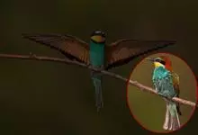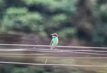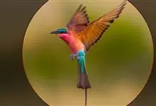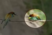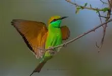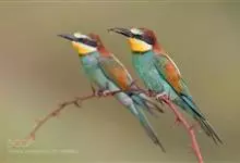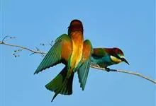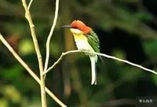 栗喉蜂虎是蜂虎科蜂虎属的鸟类。有热带鸟类羽毛艳丽的特征:喉部是栗红色的,黑色的过眼纹,翅膀和背部是绿色的,尾翼是蓝色的,飞行时翅膀下面的羽毛是橙黄色的,在阳光的照射下,它们全身闪烁着金属般的艳丽光泽,…全部>>