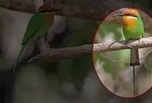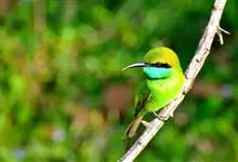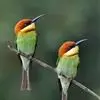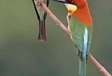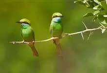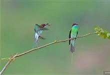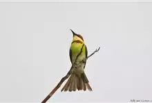 绿喉蜂虎是佛法僧目、蜂虎科的小型鸟类,共有9个亚种。身长22-25厘米,翼展29-30厘米,体重15-20克。喉绿色,额部、头顶至上背为锈红色,其余上体均为亮绿色。中央尾羽延长且端段狭细,…全部>>
