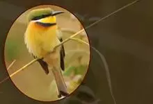黄喉蜂虎属中型鸟类,体长23-30厘米。喉黄色,其下有一窄的黑色胸带;胸带以下的整个下体蓝绿色。前额蓝白色,具一宽的黑色贯眼纹,头顶至后颈暗栗色,尾蓝绿色,中央尾羽延长,明显突出于其他尾羽。…全部>>