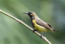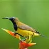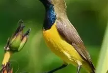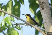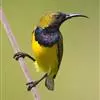 黄腹花蜜鸟是雀形目太阳鸟科花蜜鸟属鸟类。体型较小、喙略短而弯、腹部黄色。雄鸟繁殖季节颏及胸黑紫色并泛金属光泽,具有绯红色及灰色胸带,将上腹部黑色斑与前胸隔开,肩斑为橙黄色丝质羽,上体橄榄绿色,…全部>>