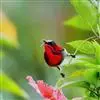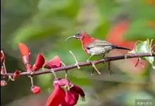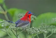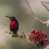 叉尾太阳鸟,雀形目太阳鸟科太阳鸟属留鸟;为小型鸟类,雄鸟头顶辉蓝绿色,上体橄榄绿色,腰明黄色,中央尾羽亮翠蓝色,羽轴针状延长,外侧尾羽黑色具白色端斑,头侧黑色,颜、喉和胸为绛红色,…全部>>