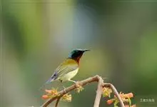 黄腰太阳鸟共有16个亚种,小型鸟类,体长10-15厘米。嘴细长而向下弯曲,雄鸟额和头顶前部金属绿色,头顶后部橄榄褐色。其余头、颈、背、肩、颏、喉、胸以及翅上中覆羽和小覆羽概为红色,腰黄色,…全部>>