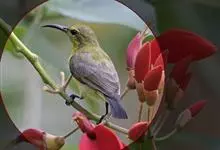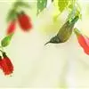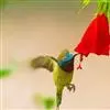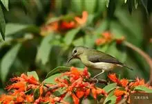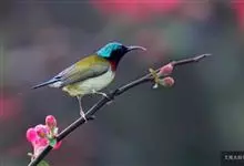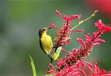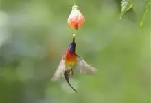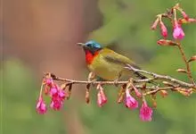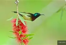 绿喉太阳鸟:共有9个亚种。小型鸟类,雄鸟体长13-15厘米、雌鸟10-12厘米。雄鸟前额至后颈、颏和喉辉绿色,头侧黑色,颈侧和背暗红色,两肩、下背橄榄绿色,腰鲜黄色,尾上覆羽和中央尾羽暗绿色,…全部>>