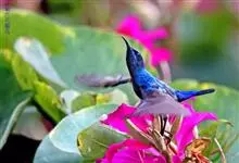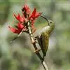 叉尾太阳鸟,雀形目太阳鸟科太阳鸟属留鸟;为小型鸟类,雄鸟头顶辉蓝绿色,上体橄榄绿色,腰明黄色,中央尾羽亮翠蓝色,羽轴针状延长,外侧尾羽黑色具白色端斑,头侧黑色,颜、喉和胸为绛红色,…全部>>