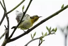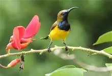 黄腹花蜜鸟是雀形目太阳鸟科花蜜鸟属鸟类。体型较小、喙略短而弯、腹部黄色。雄鸟繁殖季节颏及胸黑紫色并泛金属光泽,具有绯红色及灰色胸带,将上腹部黑色斑与前胸隔开,肩斑为橙黄色丝质羽,上体橄榄绿色,…全部>>