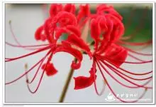 石蒜 Herb.):鳞茎近球形。秋季出叶,叶狭带状,顶端钝,深绿色,中间有粉绿色带;花茎高约30厘米;总苞片2枚,披针形;长约35厘米,宽约05厘米;伞形花序有花4-7朵;花鲜红色;花被裂片狭倒披针…全部>>