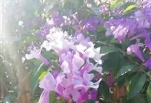 蒜香藤A.H.Gentry),又名紫铃藤、张氏紫葳,为紫葳科常绿藤状灌木。植株蔓性,具卷须,叶为二出复叶,深绿色椭圆形,具光泽。花腋生,聚伞花序,花冠筒状,开口五裂。花期春季至秋季,盛花期8-12月,…全部>>