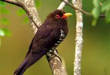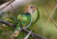 翠金鹃体长约17厘米,雄鸟上体辉绿色,头至背缀有很多棕栗色,颏和喉具黑褐色横斑;雌鸟上体自背以下具棕色羽缘。虹膜淡红褐色至绯红色,眼圈绯红色,嘴亮橙黄色,尖端黑色,脚暗褐绿色。…全部>>